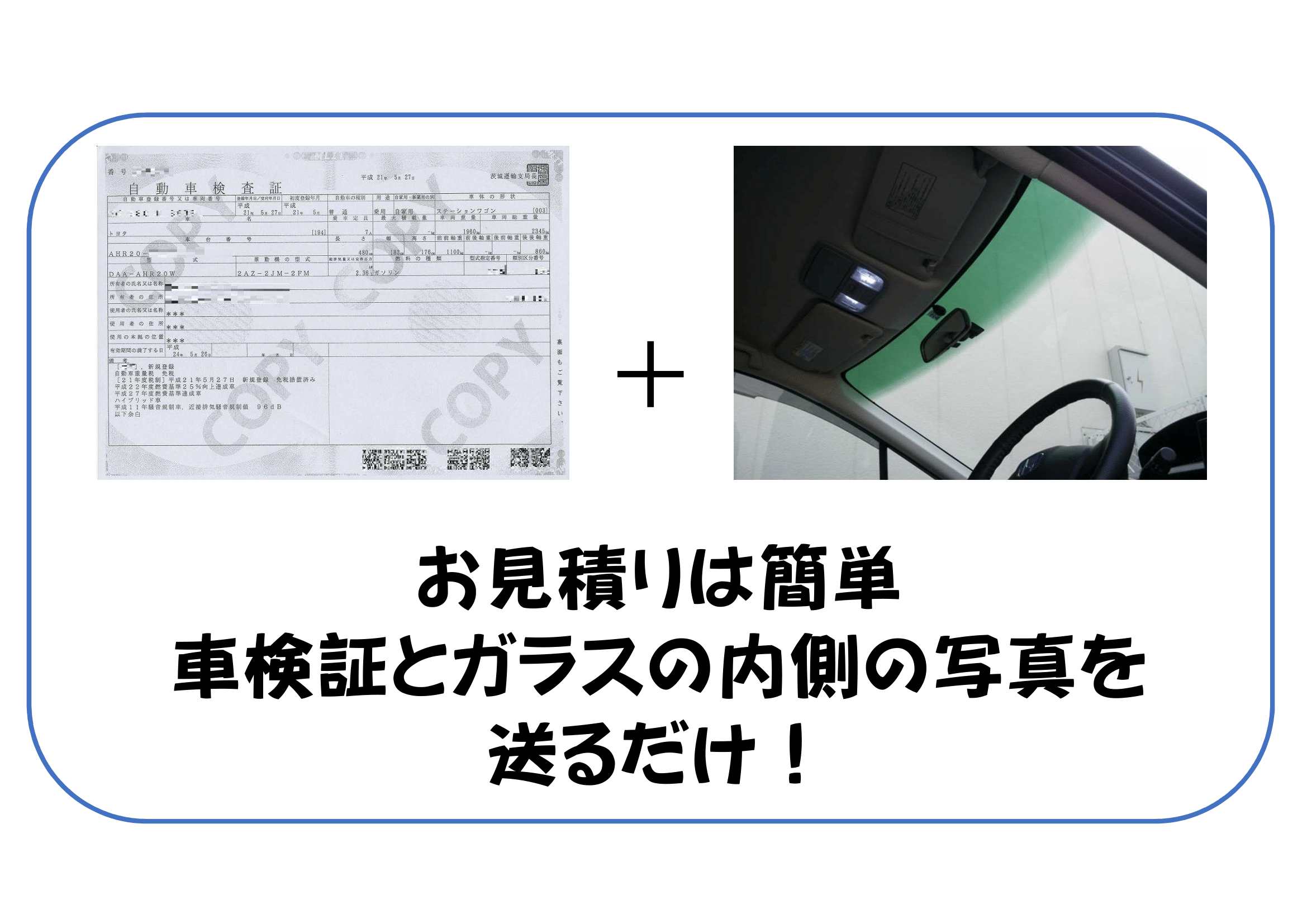 ・カメラ付き等一部の車種や輸入車のグレード、大型車種によっては交換部品、追加接着剤等の料金が必要になる場合が御座います。